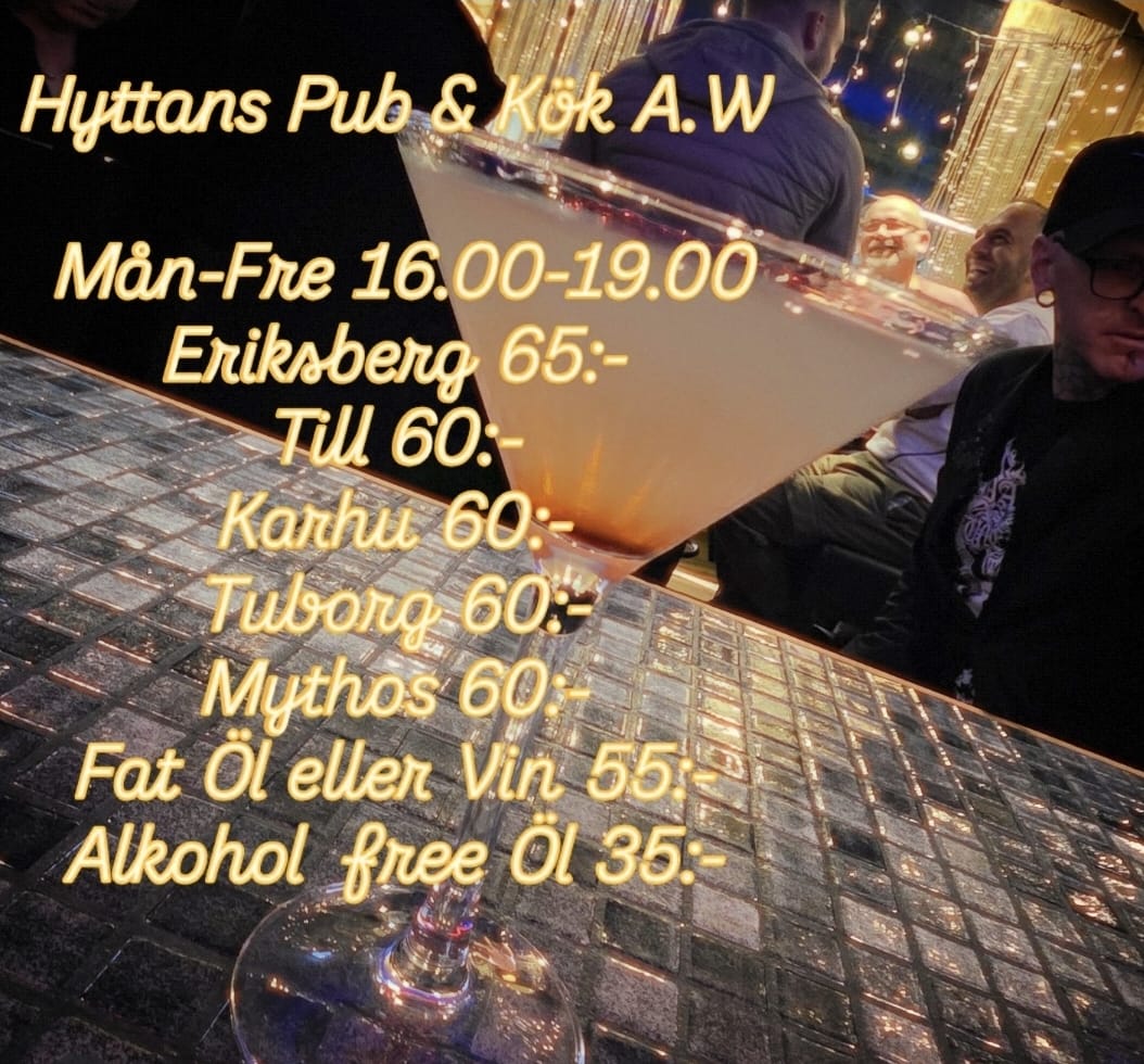 Måndag till fredag mellan 15.00 och 19.00 är det dags att lämna jobbet för en stund och byta kontorsstolen mot barstolen på Hyttans Pub & Kök. Ta med kollegorna för en avslappnad stund fylld av god mat, dryck till fina priser och skön gemenskap. Vi erbjuder Eskilstunas kvarterskrog med det lilla extra – den perfekta platsen för en minnesvärd afterwork.